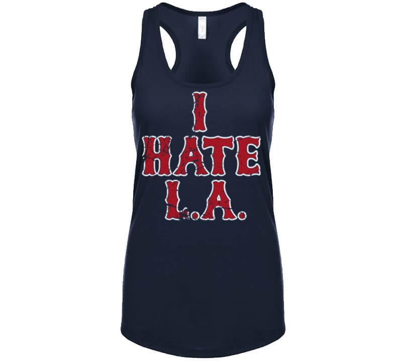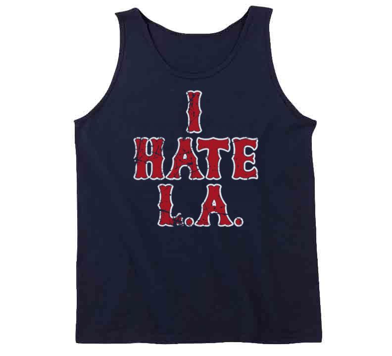I Hate LA Boston Baseball Fan Distressed T Shirt is available on a Navy 100% Cotton Tshirt. The I Hate LA Boston Baseball Fan Distressed T Shirt is available in all sizes. Please select your desired shirt style and size from the drop down above.