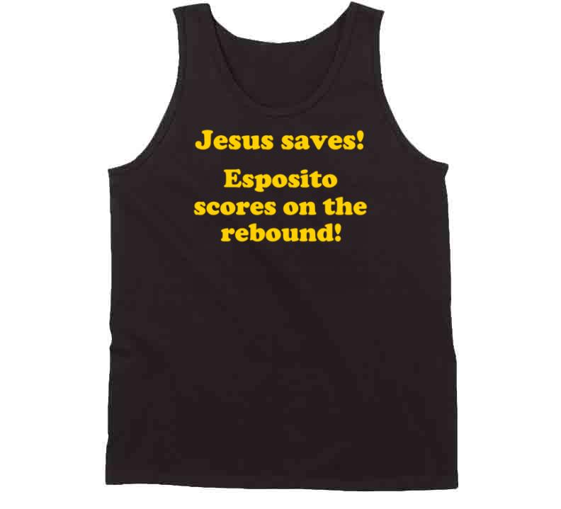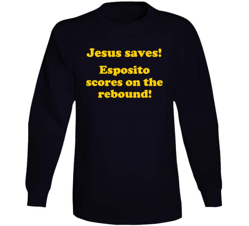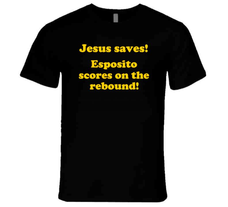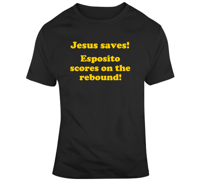 Jesus Saves Esposito Scores On The Rebound Boston Hockey Fan T Shirt is available on a Black 100% Cotton Tshirt. The Jesus Saves Esposito Scores On The Rebound Boston Hockey Fan T Shirt is available in all sizes. Please select your desired shirt style and size from the drop down above.