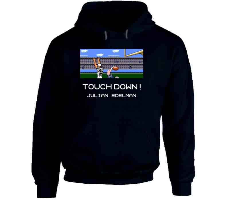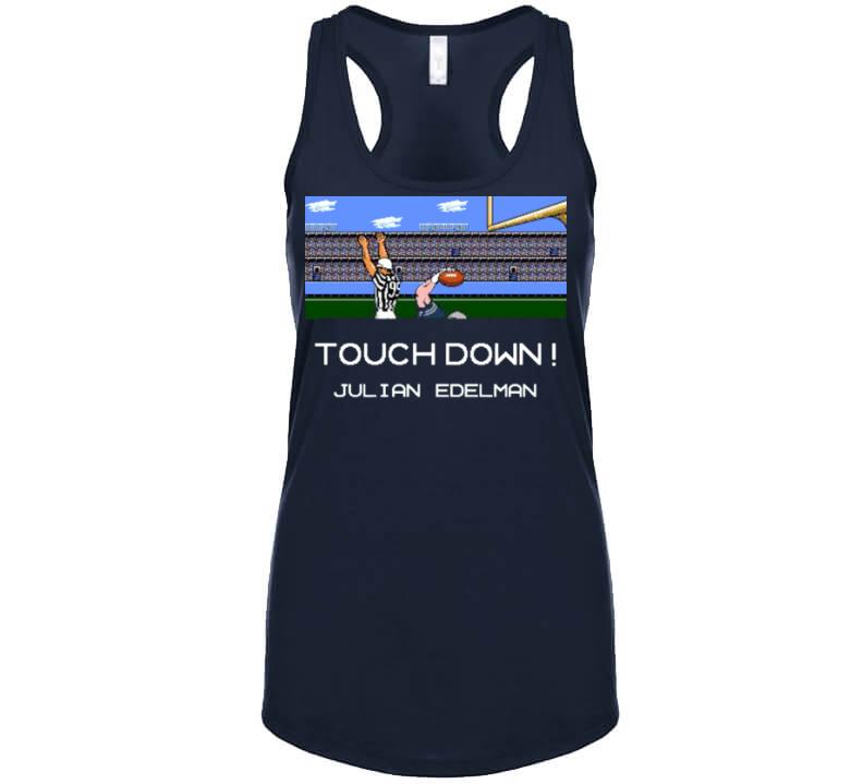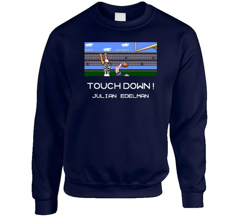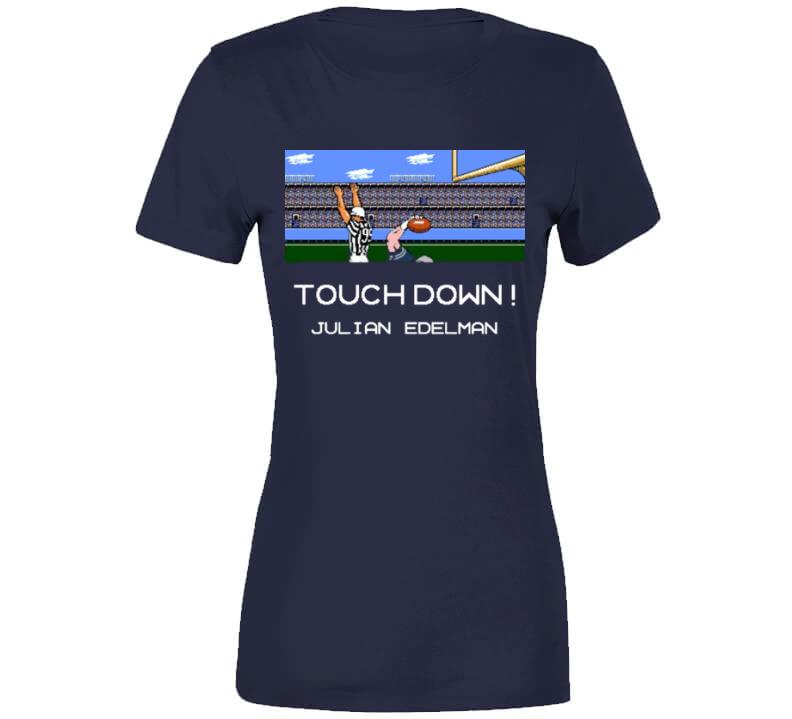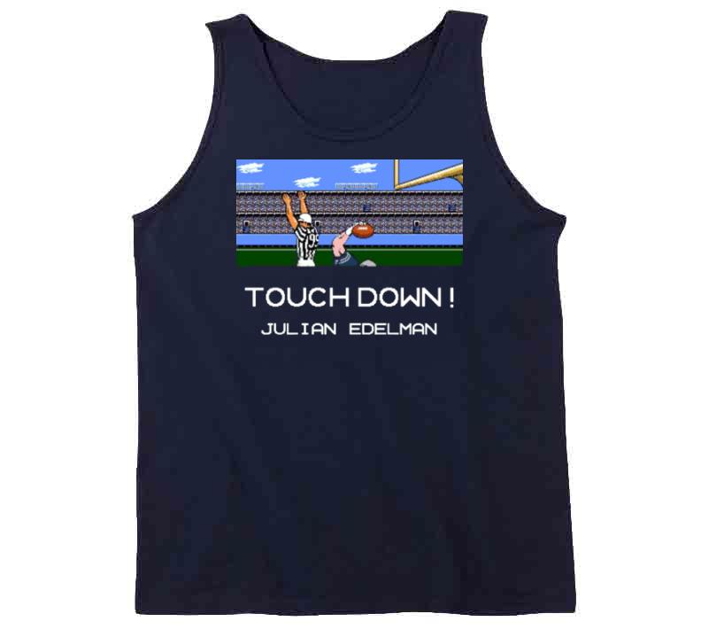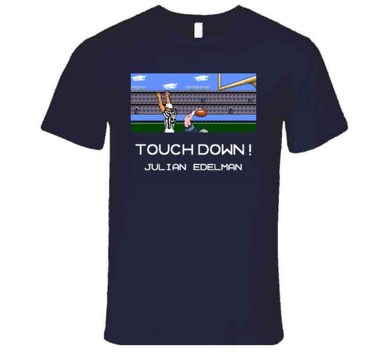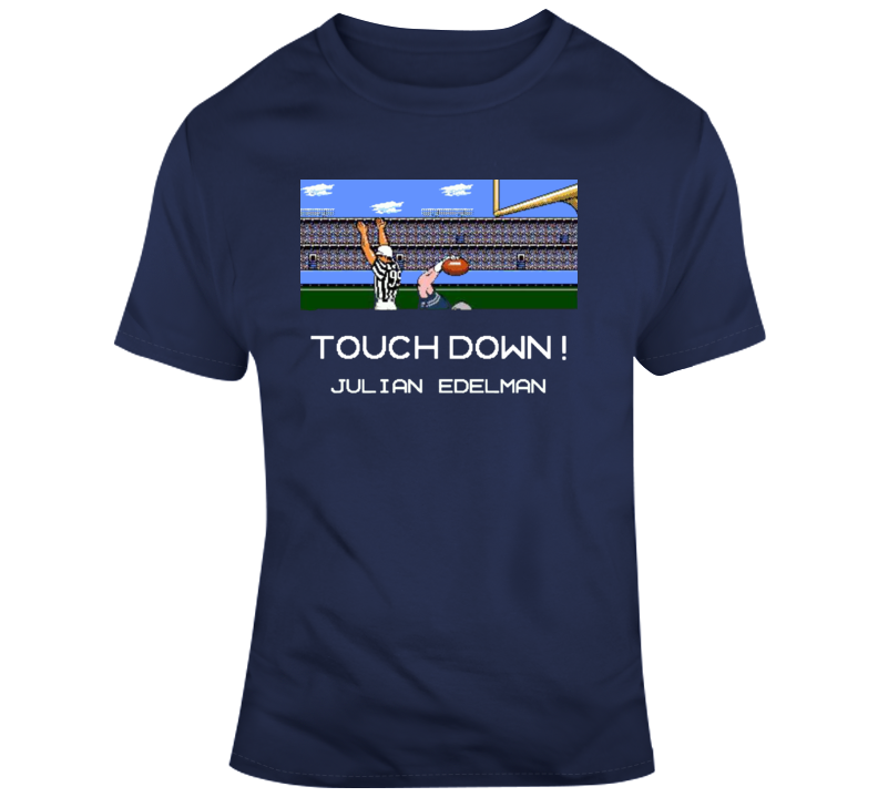 Julian Edelman Tecmo Bowl Touchdown New England Football Fan T Shirt is available on a Navy 100% Cotton Tshirt. The Julian Edelman Tecmo Bowl Touchdown New England Football Fan T Shirt is available in all sizes. Please select your desired shirt style and size from the drop down above.