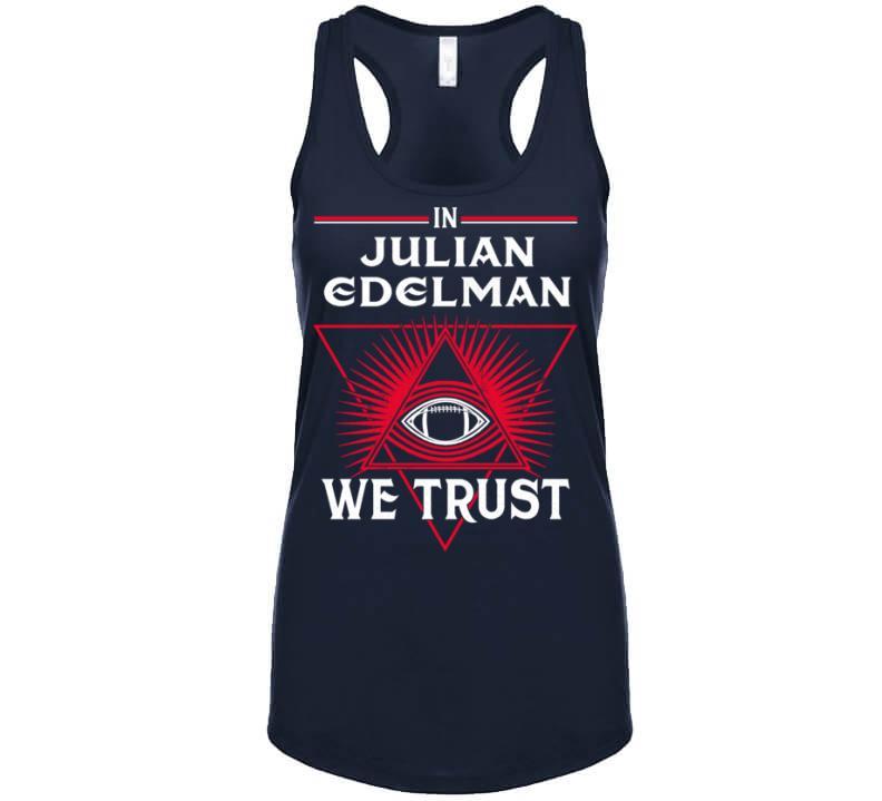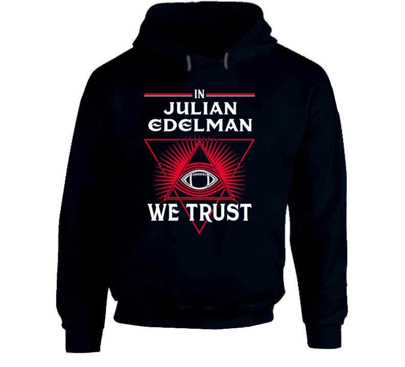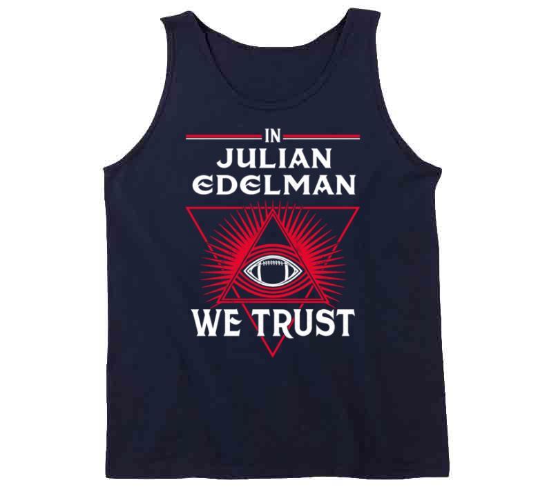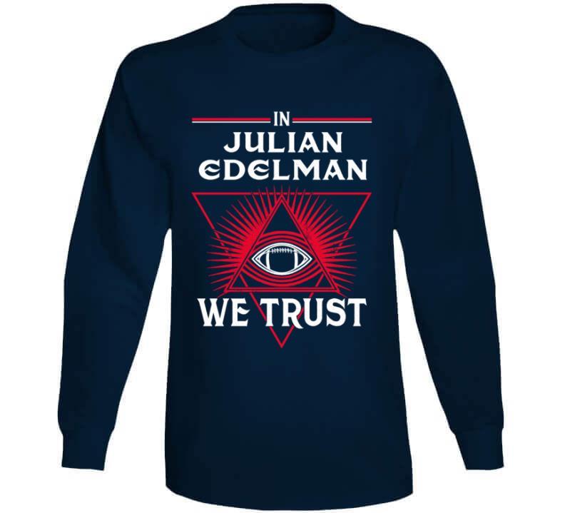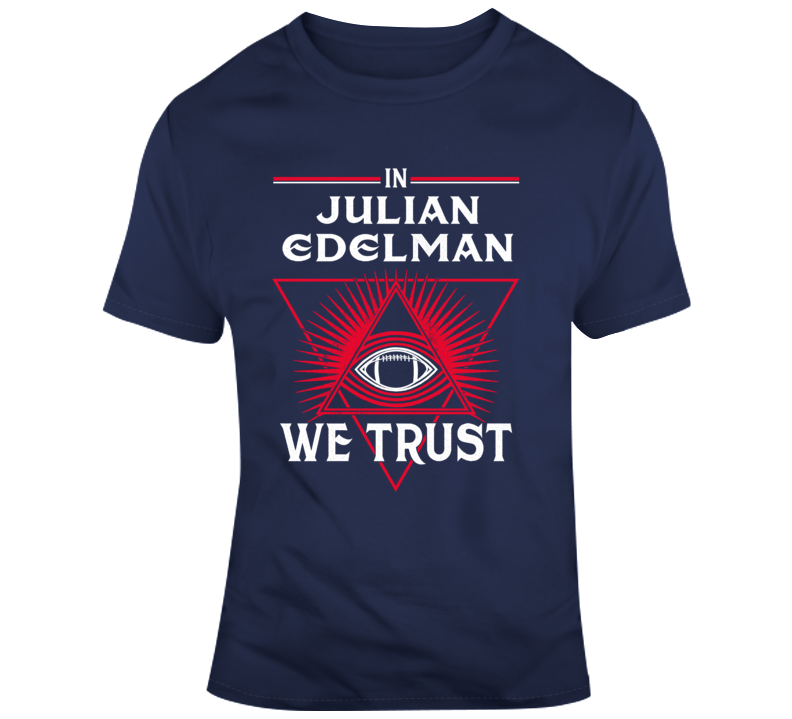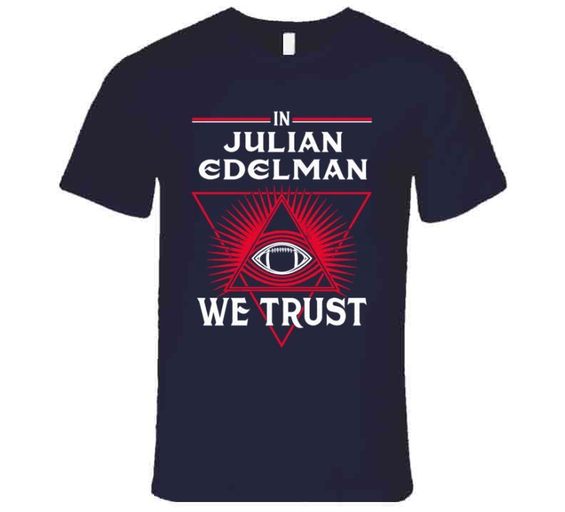 Julian Edelman We Trust New England Football Fan T Shirt is available on a Navy 100% Cotton Tshirt. The Julian Edelman We Trust New England Football Fan T Shirt is available in all sizes. Please select your desired shirt style and size from the drop down above.