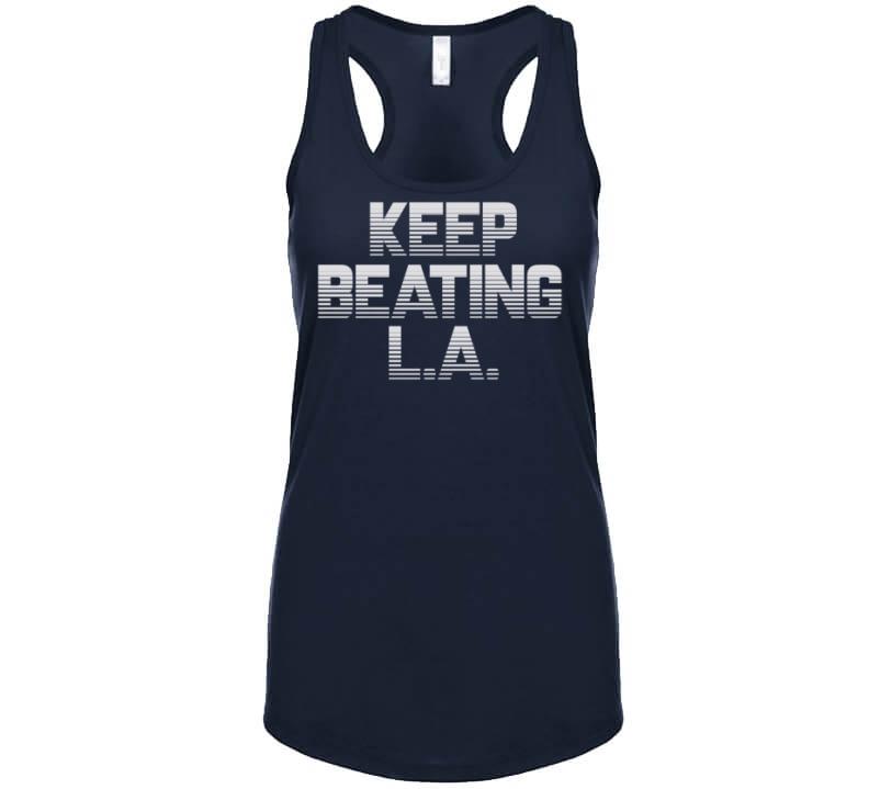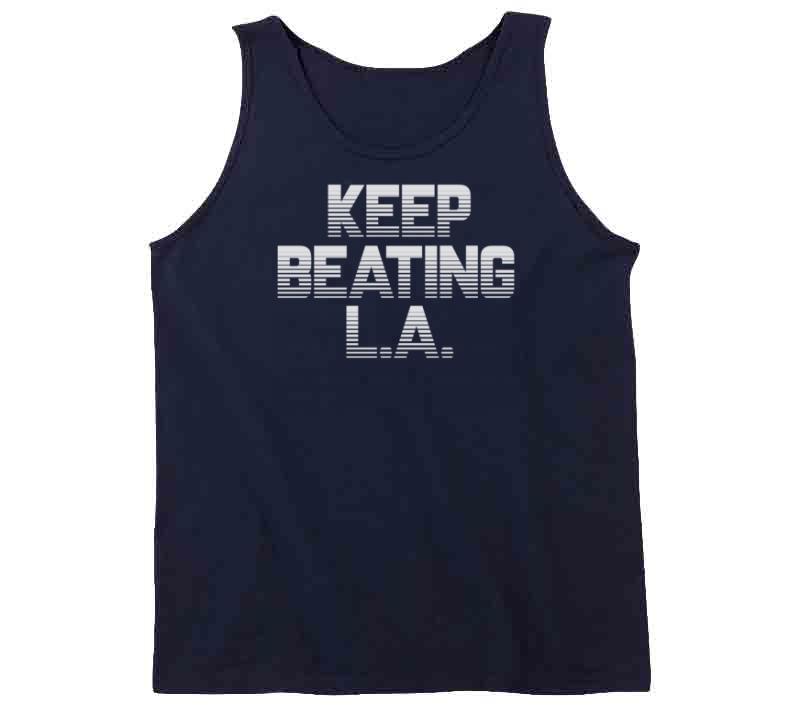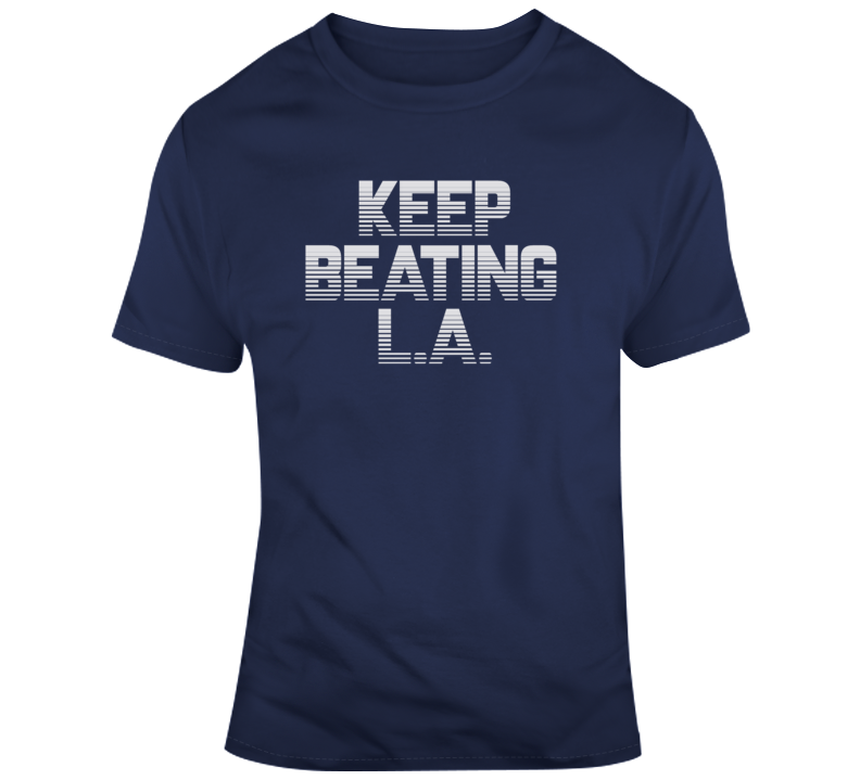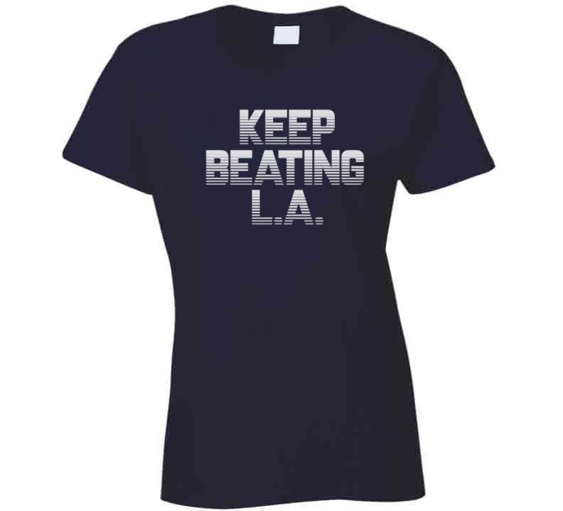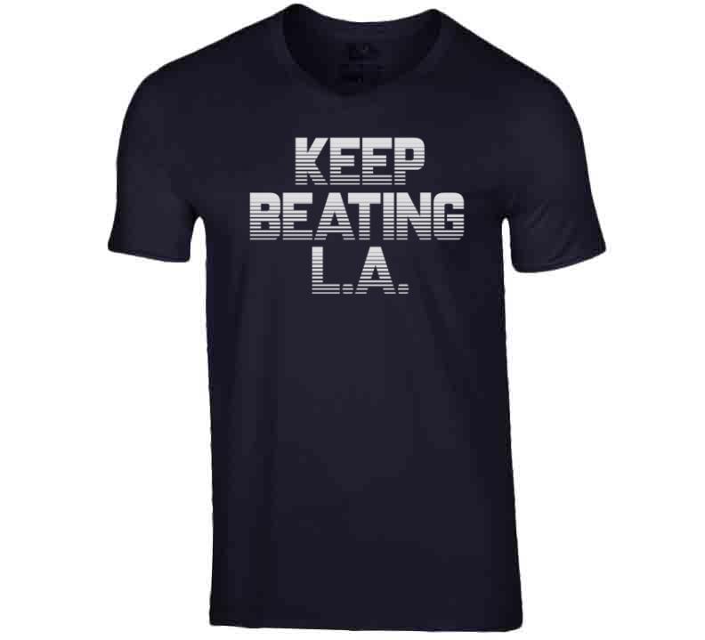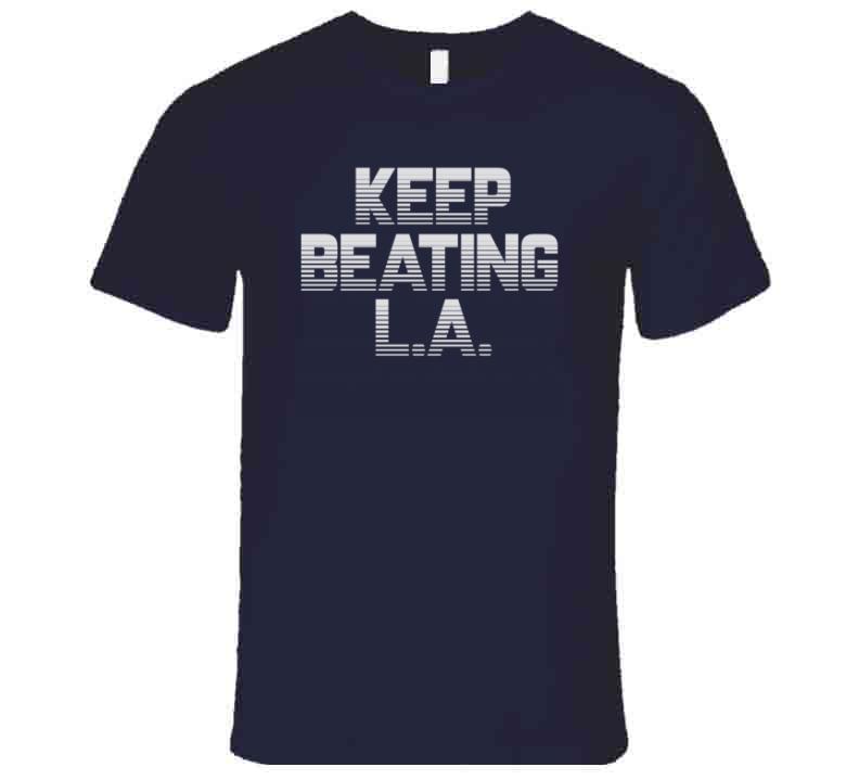 Keep Beating LA New England Football Fan v4 T Shirt is available on a Navy 100% Cotton Tshirt. The Keep Beating LA New England Football Fan v4 T Shirt is available in all sizes. Please select your desired shirt style and size from the drop down above.