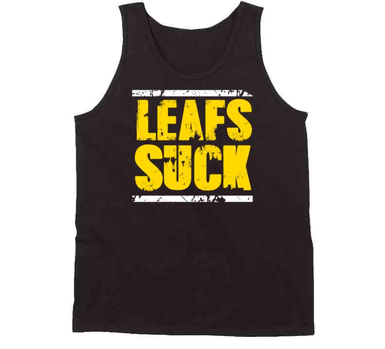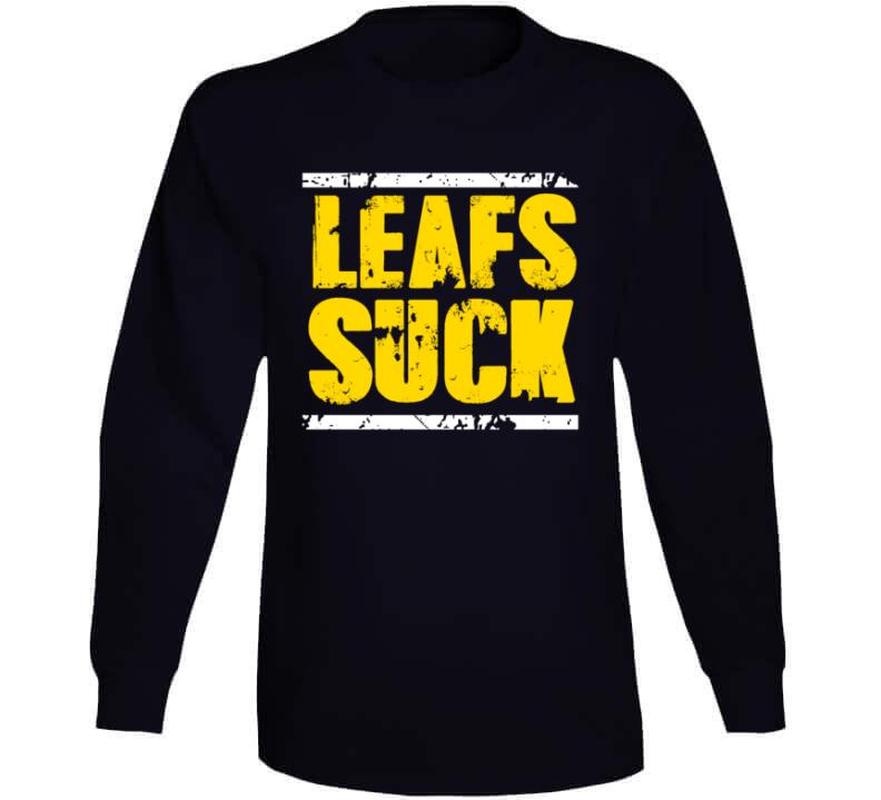 Leafs Suck Boston Playoff Hockey Fan T Shirt is available on a Black 100% Cotton Tshirt. The Leafs Suck Boston Playoff Hockey Fan T Shirt is available in all sizes. Please select your desired shirt style and size from the drop down above.